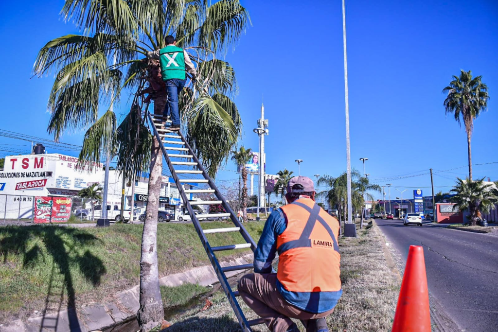 Personal del departamento de parques y jardines de la Dirección de Servicios Públicos, realiza poda de maleza y arbustos, palapeo y retiro de basura, con la finalidad de darle a esta vialidad una mejor imagen, más estética y segura para quienes transitan en ella, tanto a bordo de sus vehículos como de manera peatonal.