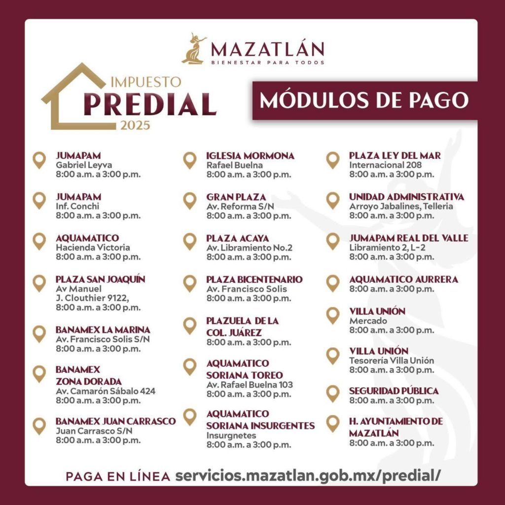 Las personas también pueden acudir a los módulos de pago instalados en el Palacio Municipal, de lunes a viernes, de 08:00 a 15:00 horas, y los sábados de 09:00 a 13:00 horas, o bien, visitar los módulos ubicados en diversos puntos como JUMAPAM Gabriel Leyva, JUMAPAM El Conchi, Aquamático Hacienda Victoria, Plaza San Joaquín, Banamex La Marina, Banamex Zona Dorada, Banamex Juan Carrasco, Gran Plaza, Plaza Acaya, Plazuela Juárez, entre otros.