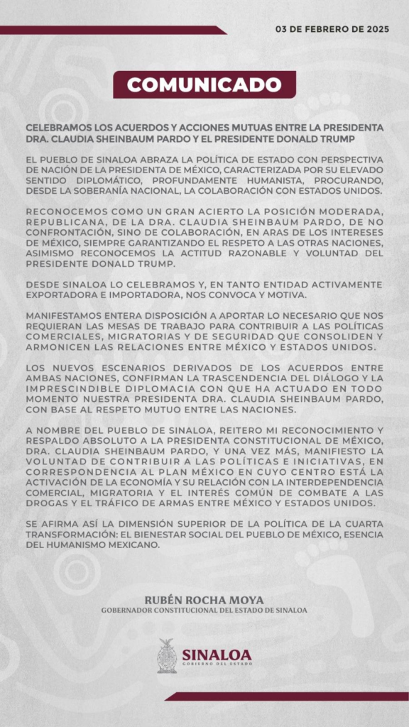 El gobernador Rubén Rocha Moya reiteró el respaldo absoluto del pueblo sinaloense a la política exterior de Sheinbaum y manifestó su disposición para contribuir en las mesas de trabajo. “Los nuevos escenarios derivados de estos acuerdos confirman la trascendencia del diálogo y la imprescindible diplomacia con que ha actuado en todo momento nuestra presidenta”, expresó.