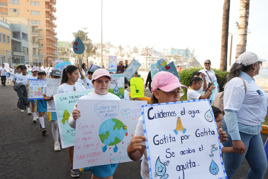 Al grito unísono de “el agua es vida, cuídala”, cientos de niñas, niños, adolescentes, jóvenes y adultos participaron con “Tita la gotita”, en el Desfile del Agua 2025, que el Gobierno de Mazatlán, a través de JUMAPAM, realizó este jueves para conmemorar de forma anticipada el Día Mundial del Agua, que bajo el lema “Salvemos nuestros glaciares” se celebra cada 22 de marzo. Caminaron desde el Paseo Olas Altas hasta el Palacio Municipal, donde pintaron un emotivo mural titulado “Una mano por el agua”.