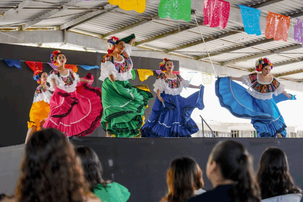 Cientos de alumnos del turno matutino abandonaron momentáneamente las clases para disfrutar una muestra dancística representativa de los estados de Jalisco, Chiapas y Sinaloa.