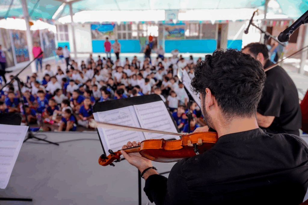 La presentación del programa Cultura en la Educación del Instituto Municipal de Cultura, Turismo y Arte de Mazatlán, incluyó un repertorio cuidadosamente seleccionado para despertar el interés infantil, entre los que destacaron temas de películas de Disney, del icónico videojuego Mario Bros, y obras maestras de compositores universales como Mozart, Scott Joplin y Carlos Gardel. La respuesta del público infantil fue inmediata y entusiasta: atentos y participativos y visiblemente emocionados, los estudiantes se dejaron llevar por la magia de la música en vivo.