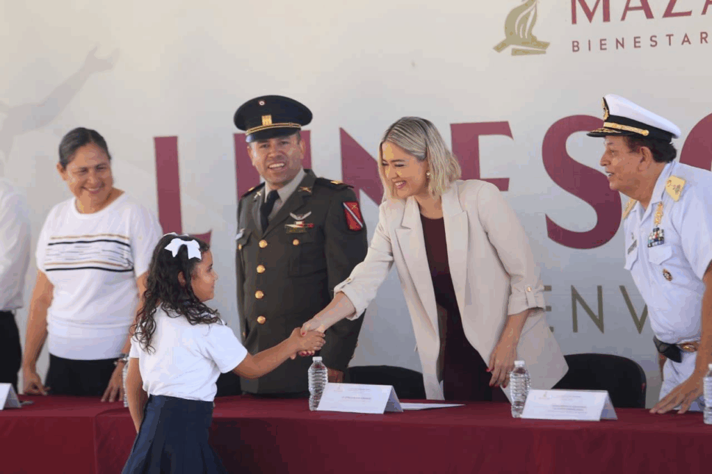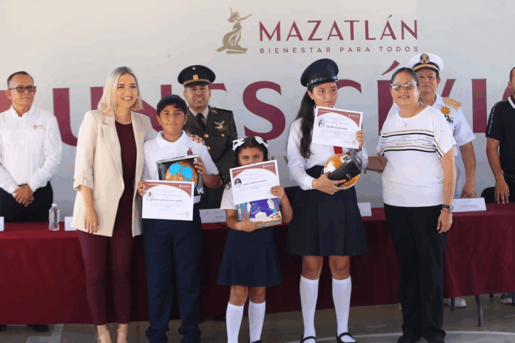 Durante la ceremonia cívica, se llevaron a cabo los honores a la Bandera, se entonó el Himno Nacional, y la Presidenta de Mazatlán realizó la entrega de una nueva Bandera, material deportivo y reconocimientos a estudiantes destacados en excelencia académica.