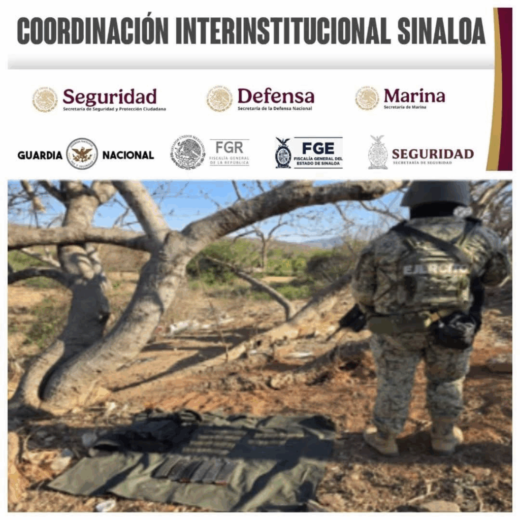Concordia, Sinaloa.- Un operativo coordinado por el Grupo Interinstitucional derivó en el aseguramiento de cargadores, cartuchos, artefactos expl0siv0s improvisados y equipo táctico durante reconocimientos realizados en la comunidad de Las Iguanas, en el municipio de Concordia.