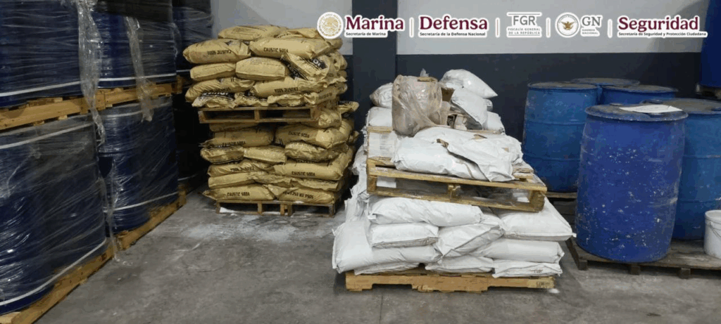 Lo anterior se derivó de trabajos de inteligencia que permitieron la localización de los inmuebles, mismos que eran empleados por células delictivas para la fabricación de drogas sintéticas, se aseguraron aproximadamente 42.24 toneladas de metanfetamina.