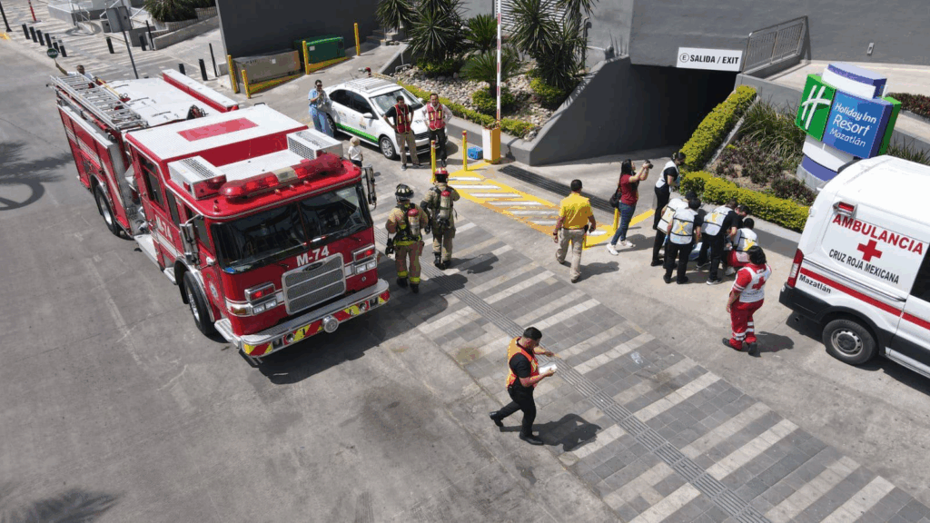 Como parte de los ejercicios de evaluación del personal que conforma las brigadas de emergencia, en este caso de conocido centro de hospedaje ubicado en la zona hotelera de Mazatlán, este miércoles se llevó a cabo un simulacro de evacuación con temática de incendio.