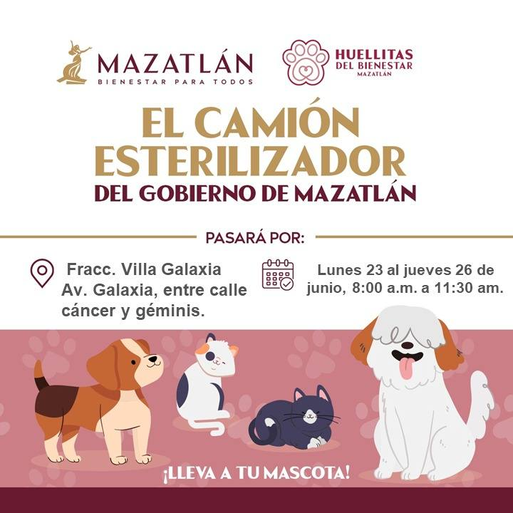 Por instrucciones de la Presidenta Municipal, Estrella Palacios Domínguez, el camión esterilizador estará del 23 al 26 de junio en el fraccionamiento Villa Galaxia, entre las calles Géminis y Cáncer, en un horario de servicio de 08:00 a 11:30 horas ofreciendo a los dueños la oportunidad de llevar a sus mascotas para ser esterilizadas sin costo alguno.