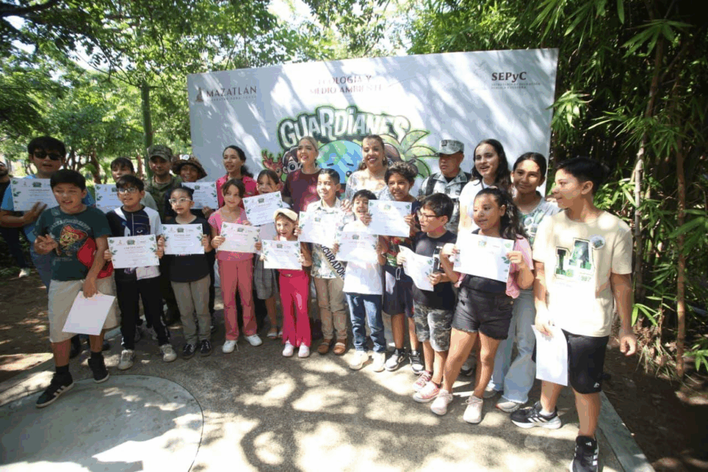En compañía de la Directora de Ecología y Medio Ambiente del Ayuntamiento, Monserrat Cortés Echeagaray, y la representante de Servicios Regionales de la Secretaría de Educación Pública y Cultura (SEPyC) en Mazatlán, Acela Sánchez Sánchez, Palacios Domínguez hizo entrega de las insignias y certificados a las 30 niñas y niños que participaron en el campamento “Verano con los Guardianes”, que a partir de ahora, se suman al Gobierno con la tarea de defender el entorno y a todos los seres vivos como “Guardianes del Medio Ambiente”.
