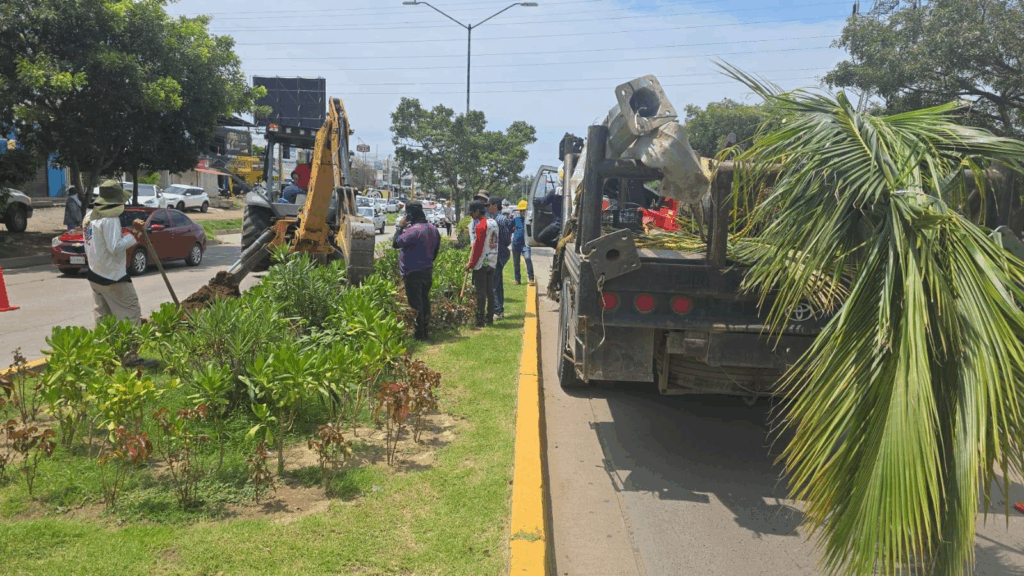 Karla Angélica Camacho Guzmán, Directora de la dependencia del Ayuntamiento, informó que se han extraído 14 de las 18 palmas sobre el camellón de dicha vialidad, con apoyo de una retroexcavadora y una grúa de plataforma.