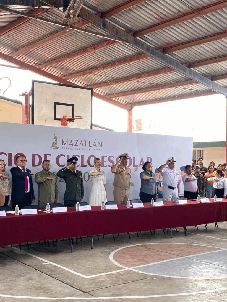 Durante la ceremonia cívica, Palacios Domínguez estuvo acompañada por funcionarios municipales, el jefe de los Servicios Regionales de Educación, José Juan Rendón Gómez, así como Salvador Medina Casiano, Director de la primaria sede, e integrantes de Marina y Ejército Mexicano, quienes refrendaron su compromiso de trabajar en coordinación para fortalecer la formación de la niñez mazatleca.