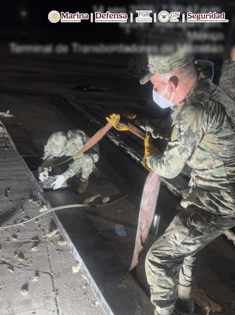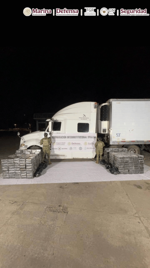 Resultado de labores de vigilancia, verificación y control, en la terminal de Transbordadores del Puerto de Mazatlán, Sinaloa, elementos de la Secretaría de Marina (Semar) en coordinación con la Secretaría de la Defensa Nacional (Defensa), Guardia Nacional (GN), Secretaría de Seguridad y Protección Ciudadana (SSPC) y Fiscalía General de la República (FGR) aseguraron un tractocamión acoplado a una caja que transportaba oculto en un doble fondo paquetes con posible metanfetamina, con un peso aproximado de 1.5 toneladas.