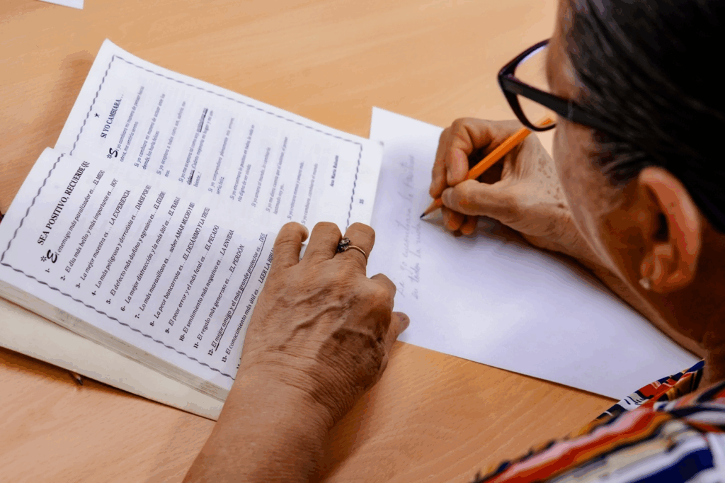 Posteriormente, cada uno de los participantes elaboró una “cita personal” inspirada en la lectura o en alguna experiencia de vida. Este ejercicio creativo permitió que los abuelos, jóvenes y adultos presentes pusieran en palabras sus pensamientos y emociones, generando un intercambio enriquecedor de ideas. Las frases resultantes se convirtieron en pequeños destellos de sabiduría y memoria compartida.