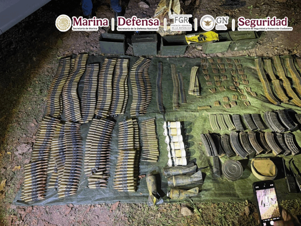 Ahí se hallaron tres armas largas, 1,770 cartuchos de diferentes calibres, 37 cargadores, un paquete con marihuana, un paquete con cocaína, cuatro camionetas con blindaje artesanal, entre los que se encontraba una unidad apócrifa de una institución de seguridad federal, 42 artefactos explosivos improvisados, dos radios, seis chalecos con placas, cuatro cascos y ropa táctica.