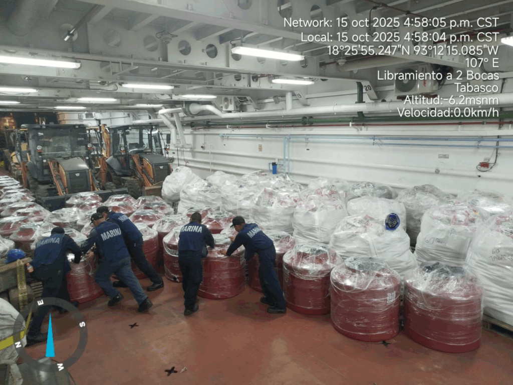 En este contexto, el Buque de Apoyo Logístico ARM “Isla Holbox” zarpó esta mañana de la Tercera Región Naval, con sede en Dos Bocas, Tabasco, con 90 elementos a bordo en apoyo a las Brigadas de Respuesta a Emergencias, con aproximadamente 60 toneladas de víveres, insumos médicos, casas de campaña, catres, una embarcación tipo IMEMSA, siete retroexcavadoras, una tonelada de material de zapa y 116 tinacos, sumando aproximadamente 58.8 toneladas de material y equipo (aproximadamente 120 toneladas en total), con el fin de brindar apoyo a la población en el estado de Veracruz, formando así el tercer puente marítimo realizado durante el presente Plan Marina.
