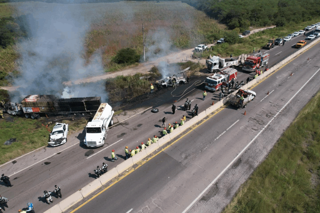 En el sitio, ubicado a la altura del kilómetro 29, quedó atravesado un tráiler con remolque, un camión de volteo y dos unidades oficiales que circulaban por la zona cuando ocurrió el impacto. Tras el choque, parte del material de una de las unidades se incendió, generando una columna de humo que alertó a quienes transitaban por la carretera.