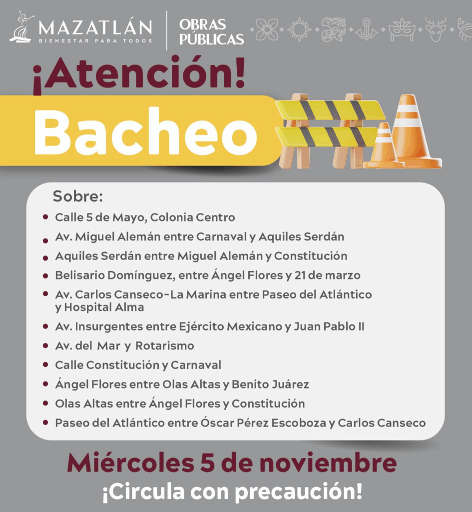 La Dirección de Obras Públicas del Ayuntamiento, exhorta a la ciudadanía a tomar sus precauciones, porque este miércoles estará realizando trabajos del programa “MazBachetón” en distintos puntos de la ciudad, con el objetivo de mejorar las calles y vialidades para garantizar una óptima circulación para automovilistas y peatones.