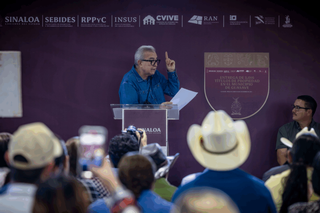 “Me da mucho gusto estar hoy aquí acompañando al gobernador del estado, al doctor Rubén Rocha Moya, en un evento que tiene un profundo significado para las familias de Guasave, la entrega de 3 mil 16 nuevos títulos de propiedad”, dijo.