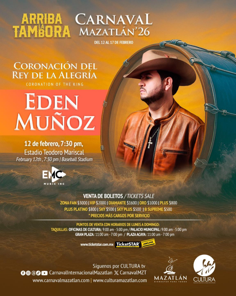 El 12 de febrero, el Estadio Teodoro Mariscal recibirá a Edén Muñoz, uno de los artistas más esperados por el público mazatleco ![]()
