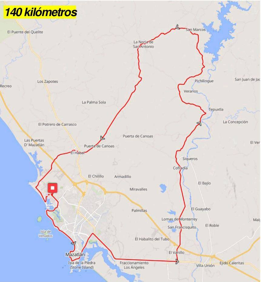 Por su parte, la ruta de 140 kilómetros iniciará también en el Centro de Convenciones y continuará por avenida del Delfín, Paseo del Pacífico, Paseo del Atlántico, Sábalo Cerritos, Camarón Sábalo, avenida Del Mar, Paseo Claussen, Paseo Olas Altas, Miguel Alemán, Emilio Barragán, Gabriel Leyva y la Carretera Internacional México 15 (en el tramo Café Marino– La Urraca). Posteriormente, tomará el entronque La Urraca–El Recodo, Habal-Cerritos, Sábalo Cerritos, Paseo del Atlántico, Paseo del Pacífico, avenida del Delfín y la meta en el Centro de Convenciones.
