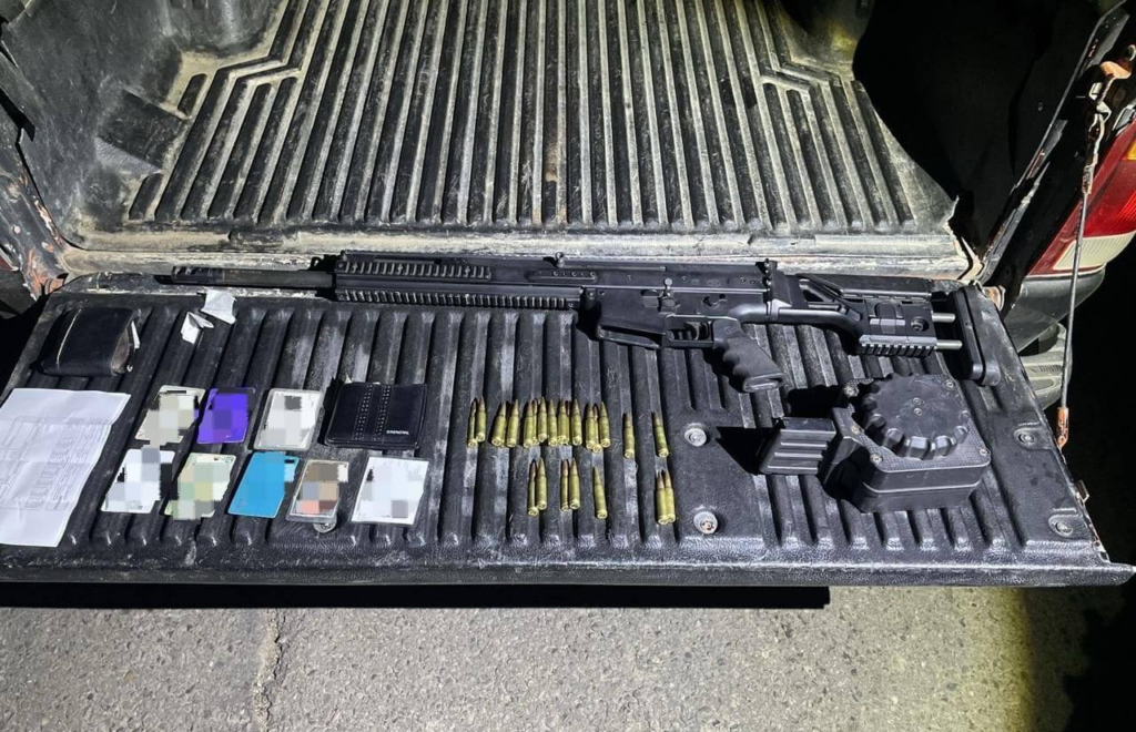 En un primer evento, durante revisiones de rutina en el puesto de seguridad instalado por la carretera libre de La Cruz de Elota-Pueblo Nuevo, se logró la detención de un presunto infractor de la ley y el aseguramiento un arma larga tipo fusil, un cargador, cartuchos y un vehículo.