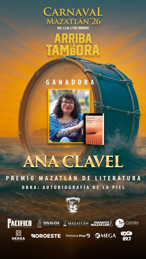 El Premio Mazatlán de Literatura, uno de los reconocimientos culturales que distinguen al Carnaval Internacional de Mazatlán por su vocación intelectual y su proyección internacional, anunció a su ganadora en el marco de la edición 2026 ¡Arriba la Tambora!: la escritora Ana Clavel, por su obra ‘Autobiografía de la piel’.
