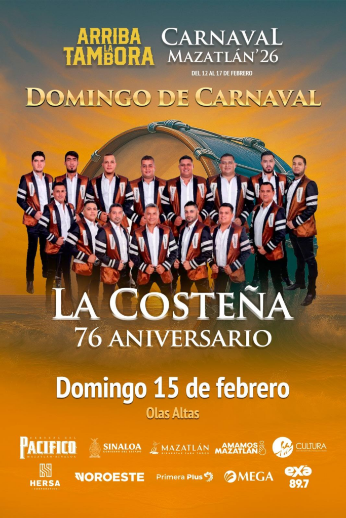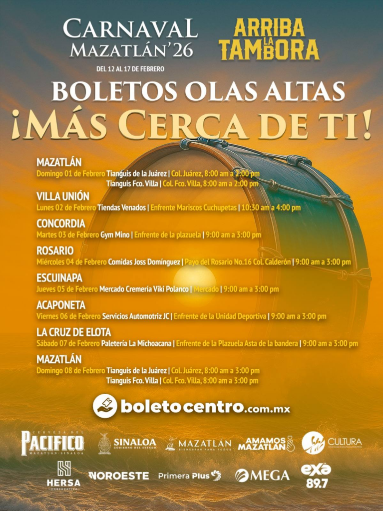 Bajo el lema «Arriba la Tambora», el área de Olas Altas vivirá una transformación histórica durante las noches del Carnaval Internacional Mazatlán 2026 ¡Arriba la Tambora!, programado del 12 al 17 de febrero. Este año, la monumental fiesta junto al mar estará amenizada exclusivamente con música de banda, el acceso se mantiene en 70 pesos, por primera vez el público podrá comprar sus boletos a través de una boletera digital y habrá una taquilla itinerante en Mazatlán, La Cruz de Elota, Villa Unión, Concordia, El Rosario, Escuinapa y Acaponeta.